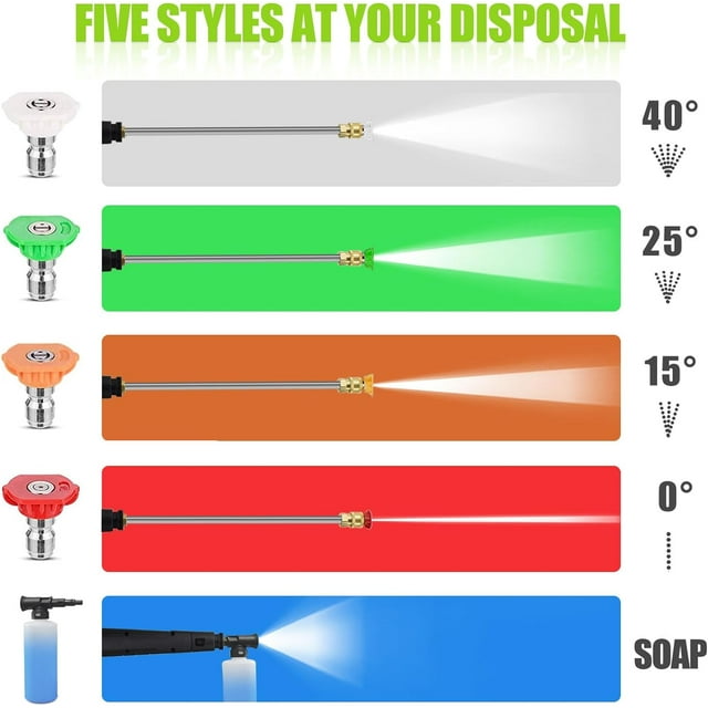 - Versatile Cleaning Options: This high-power washer machine comes with four quick-connect spray nozzles (0�, 15�, 25�, 40�), enabling you to tackle a wide range of cleaning tasks with ease.