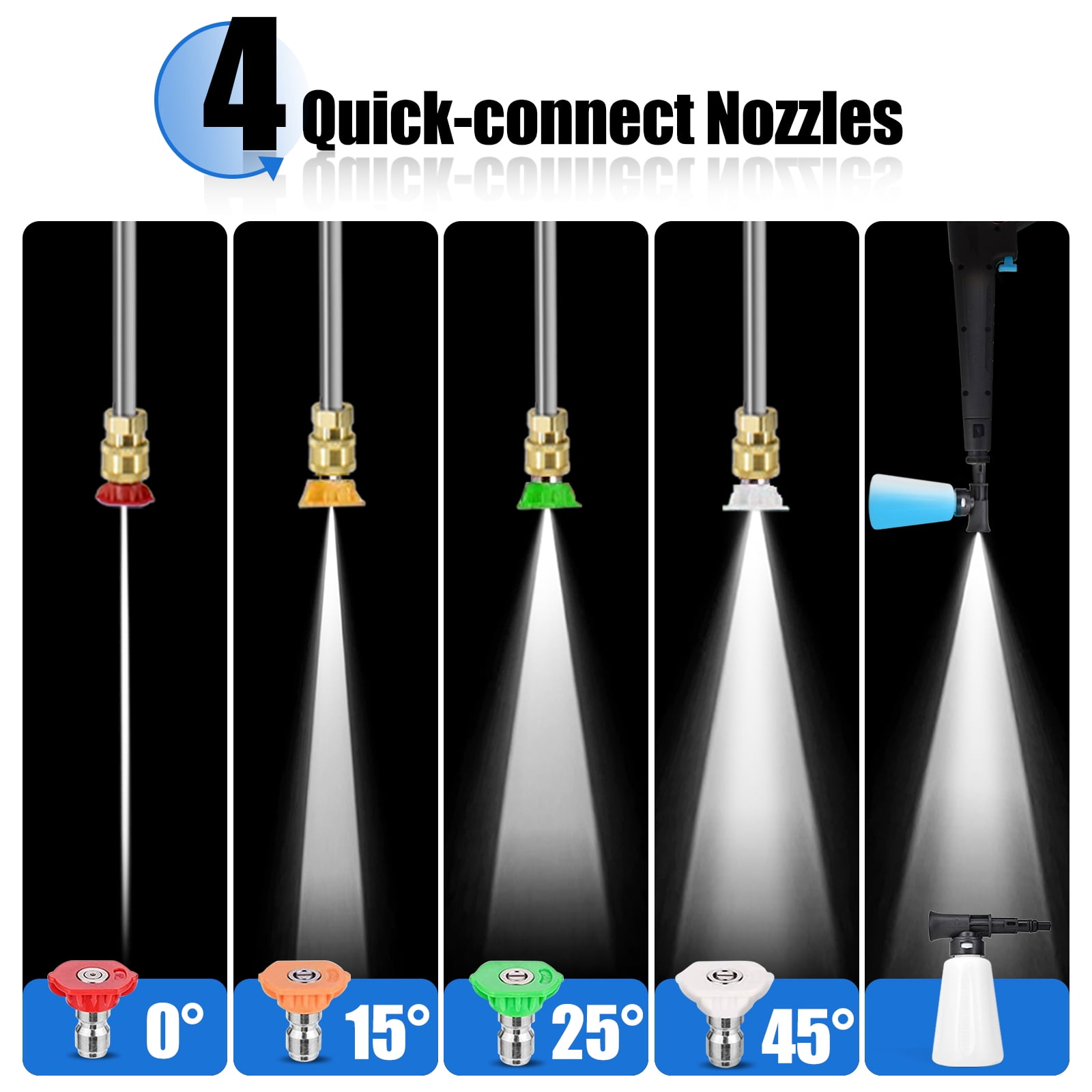 - 【5 Quick-Connect Nozzles】This pressure cleaner has 5 quick-connect nozzles (0°, 15°, 25°, 40°and soap) to provide 4 different kinds of pressure strong water stream. The attached foam cannon can produce rich bubbles to wash your car. Freely select the high-pressure nozzle best suited to your task.