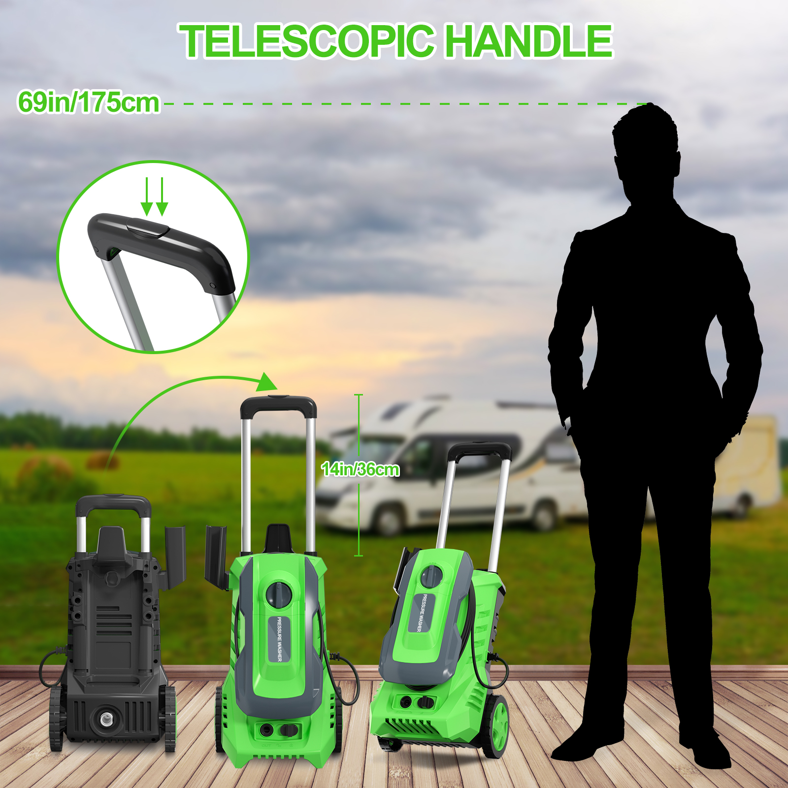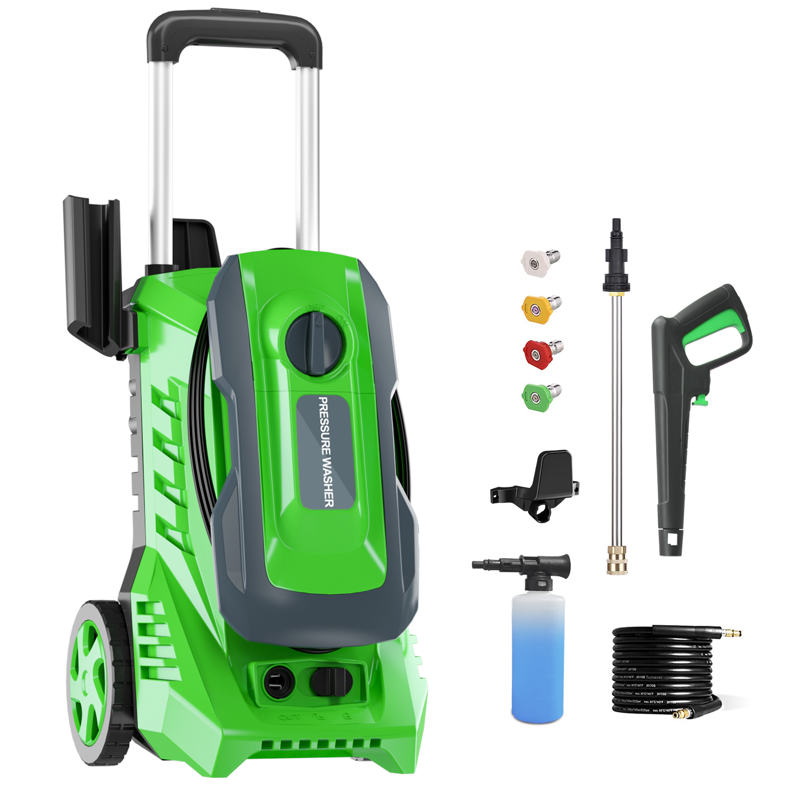 - Lightweight Machine — Portable High pressure washers complete with accessories stored on corresponding hook of the unit after use and The special wheels make the mobile washer as convenient, easy to move around as a mobile trolley case. 25FT longer hose gives you superior reach to pour water over the roof of the hose and other hard-to-reach places.