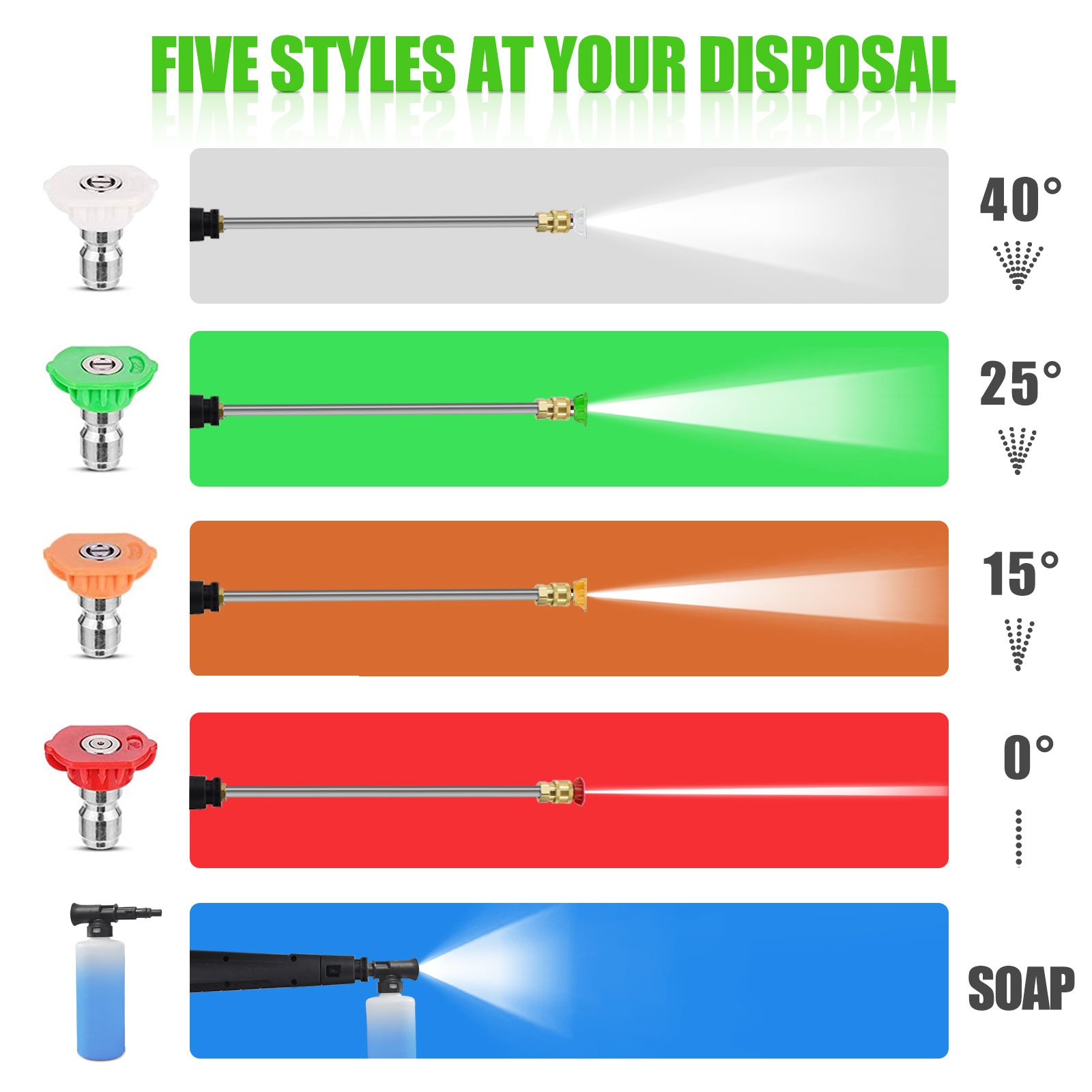 - 5 Quick-Connect Nozzles — The 0° tip delivers super high pressure for dissolving stubborn substances on hard surface. The 15° tip delivers high pressure for concrete and bric with hard surface. The 25° tip delivers medium pressure for wood decks, viynl sidings with soft surface. The 40° tip provides low pressure for windows and screens with fragile surfaces.The attached foam cannon can produce rich bubbles to wash your car. Freely select the high-pressure nozzle best suited to your task.